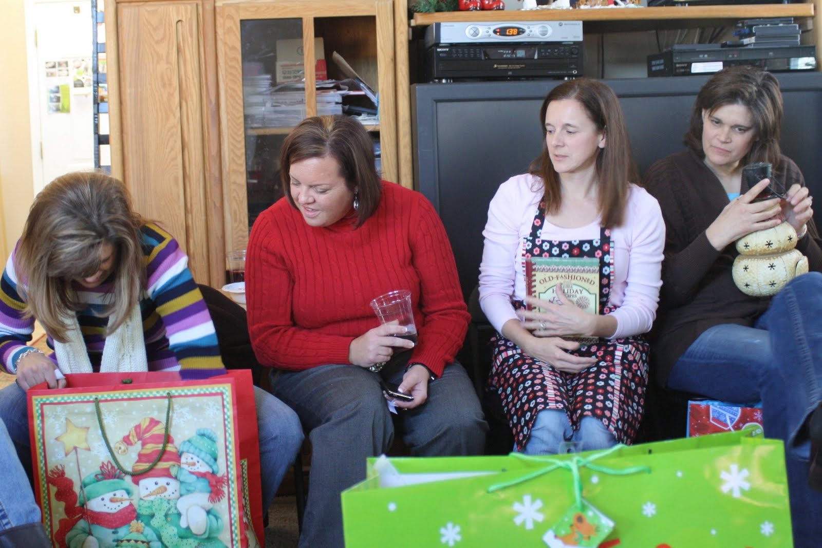 In the afternoon was the "Bowling & Crafting Friends Party". Annette and I have taken turns hosting this fun little party. We had a nice potluck luncheon of soup, salads, rolls and yummy desserts. I have to say the ladies that come to this party are great cooks. We spent an hour eating the yummy food, visiting and laughing and then the "Yankee Swap" portion of the party began. There were some fun gifts that became pretty popular: a wooden handmade standing snowman, sherpa blanket, a cute metal snowman, an apron and cookbook set...But the big fun came with the swapping. So glad we all have a great sense of humor and don't take anything too seriously.